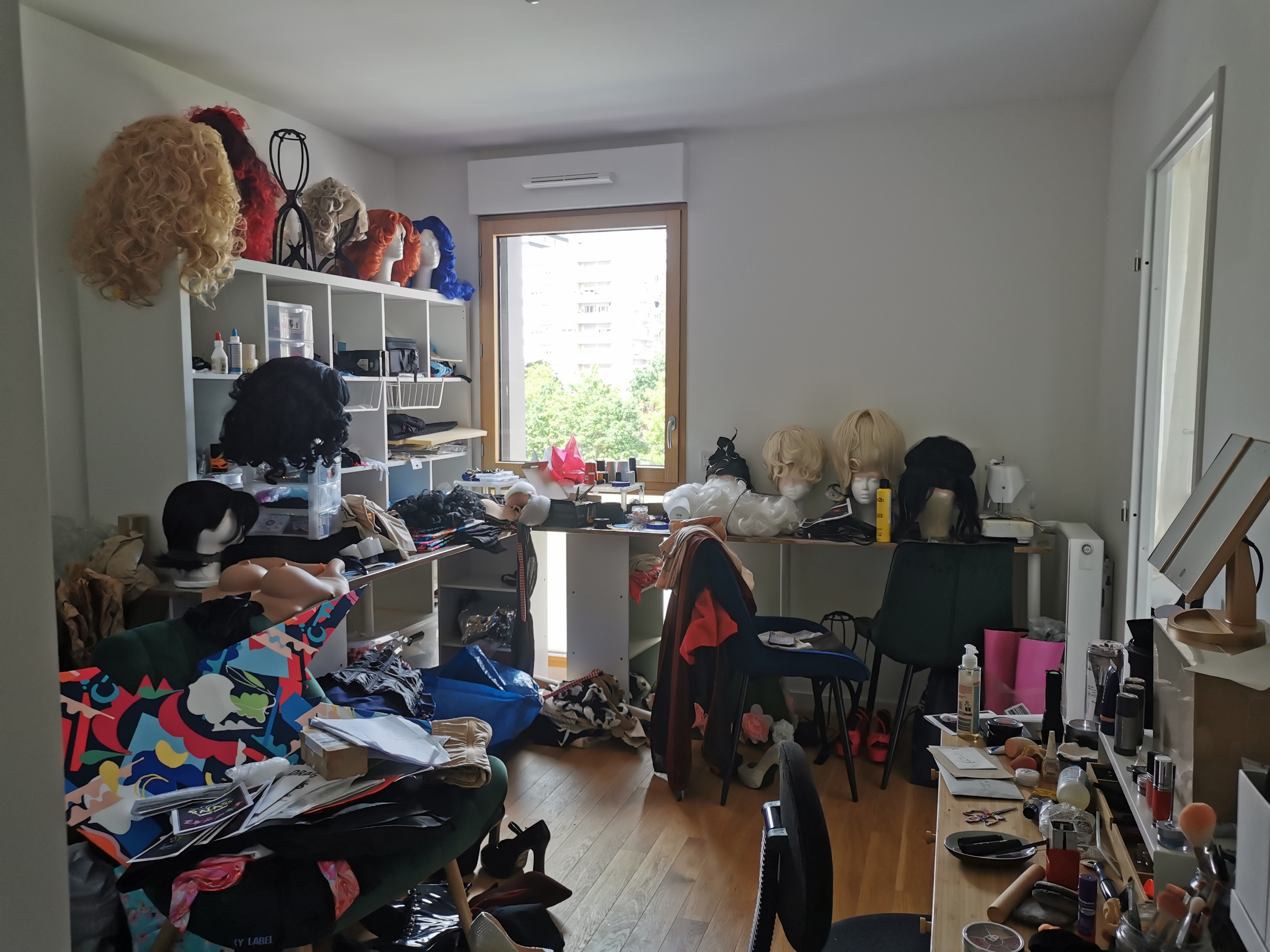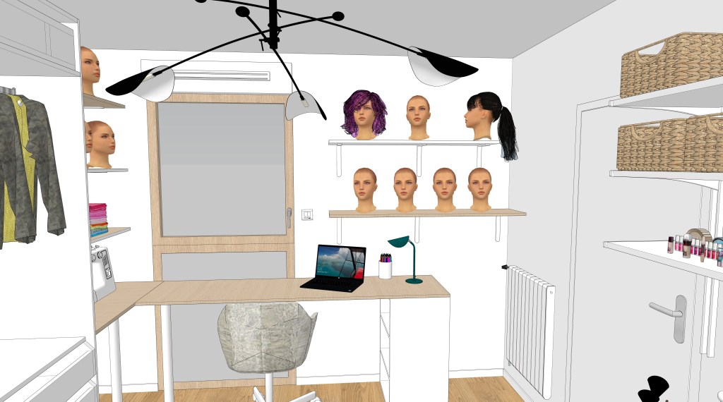 Un grand bureau, avec un espace libre nécessaire pour la couture. Des étagères en quinconce pour que les perruques plus longues puissent pendre sans s’abîmer. Au plafond, une suspension en métal noir avec bras orientables.