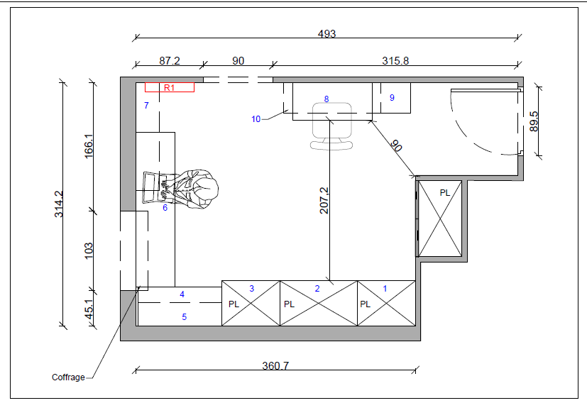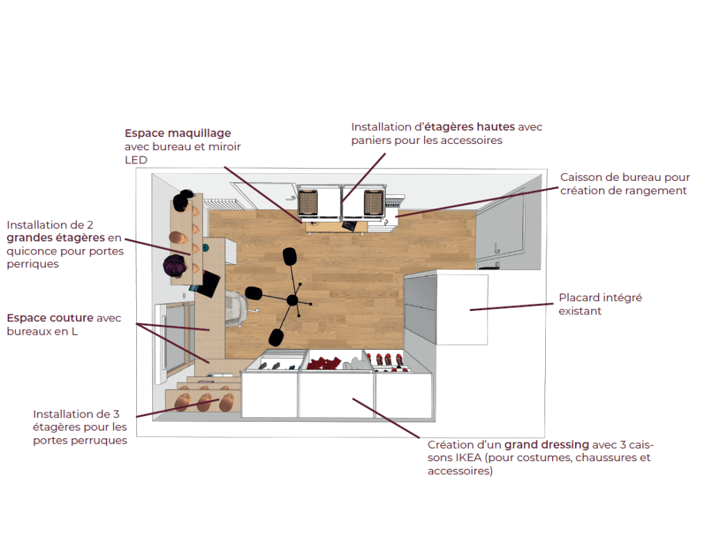 Le plan d’aménagement me permet de réfléchir aux meilleures options pour optimiser les espaces et chaque recoin. Je vérifie également les circulations. Ici, j’ai choisi de créer un grand dressing en remplacement du meuble niche, pour y ranger tous les costumes, de conserver un coin maquillage et de ré-utiliser les bureaux en L pour le coin couture. Utiliser les hauteurs me permettra également de proposer des solutions pour toutes les perruques.