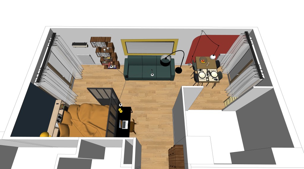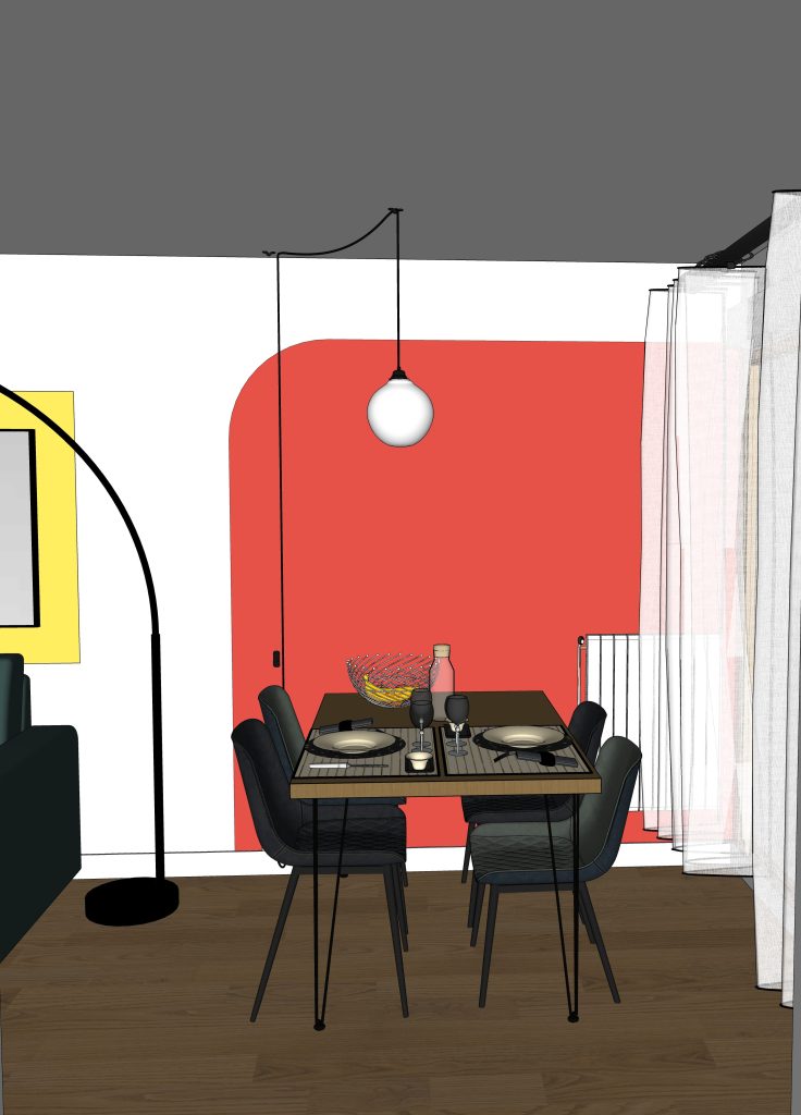 Pour cette deuxième mission, l’enjeu était de réussir à proposer un univers coloré souhaité par le client afin que chacun de les 3 espaces au sein de sa pièce de vie soit visuellement dissociés et d’apporter des solutions pour la lumière. Effectivement, seul un plafonnier est présent pour l’ensemble de cet espace.