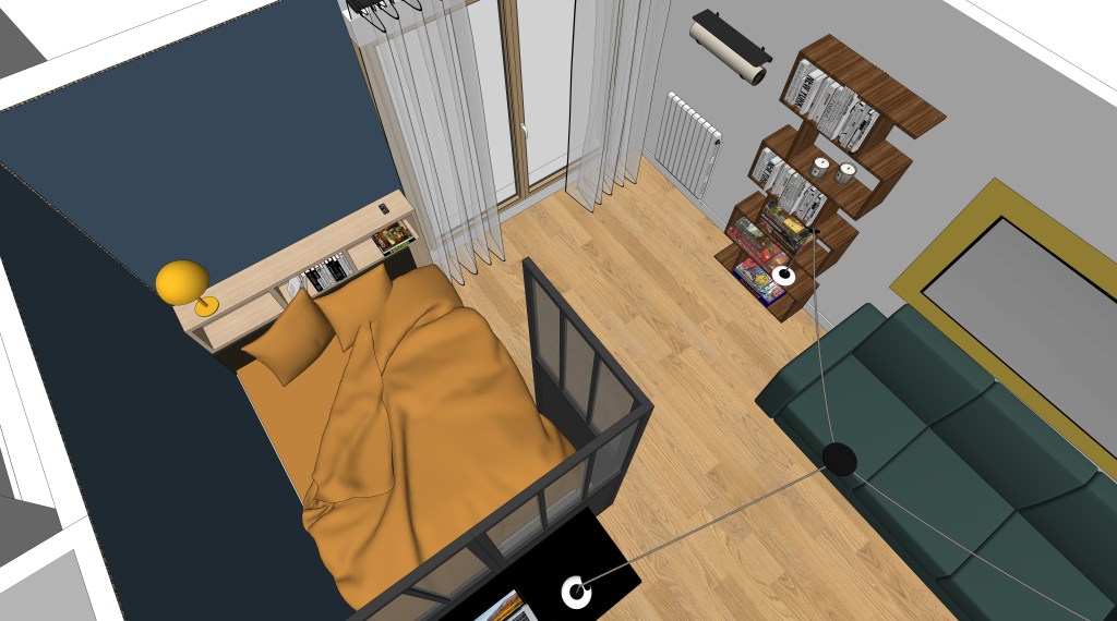 Pour la 2ème partie du projet, le client souhaitait que l’on imagine une décoration spécifique dans sa pièce de vie, une pièce qui fait office de coin nuit (la chambre étant dédiée à l’atelier), de coin salon et de coin repas.