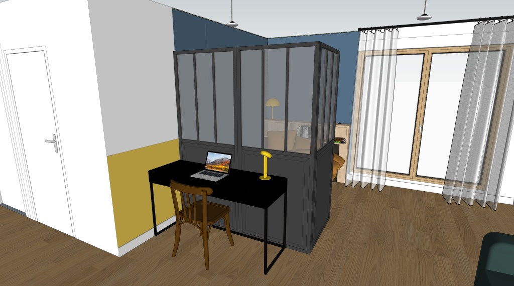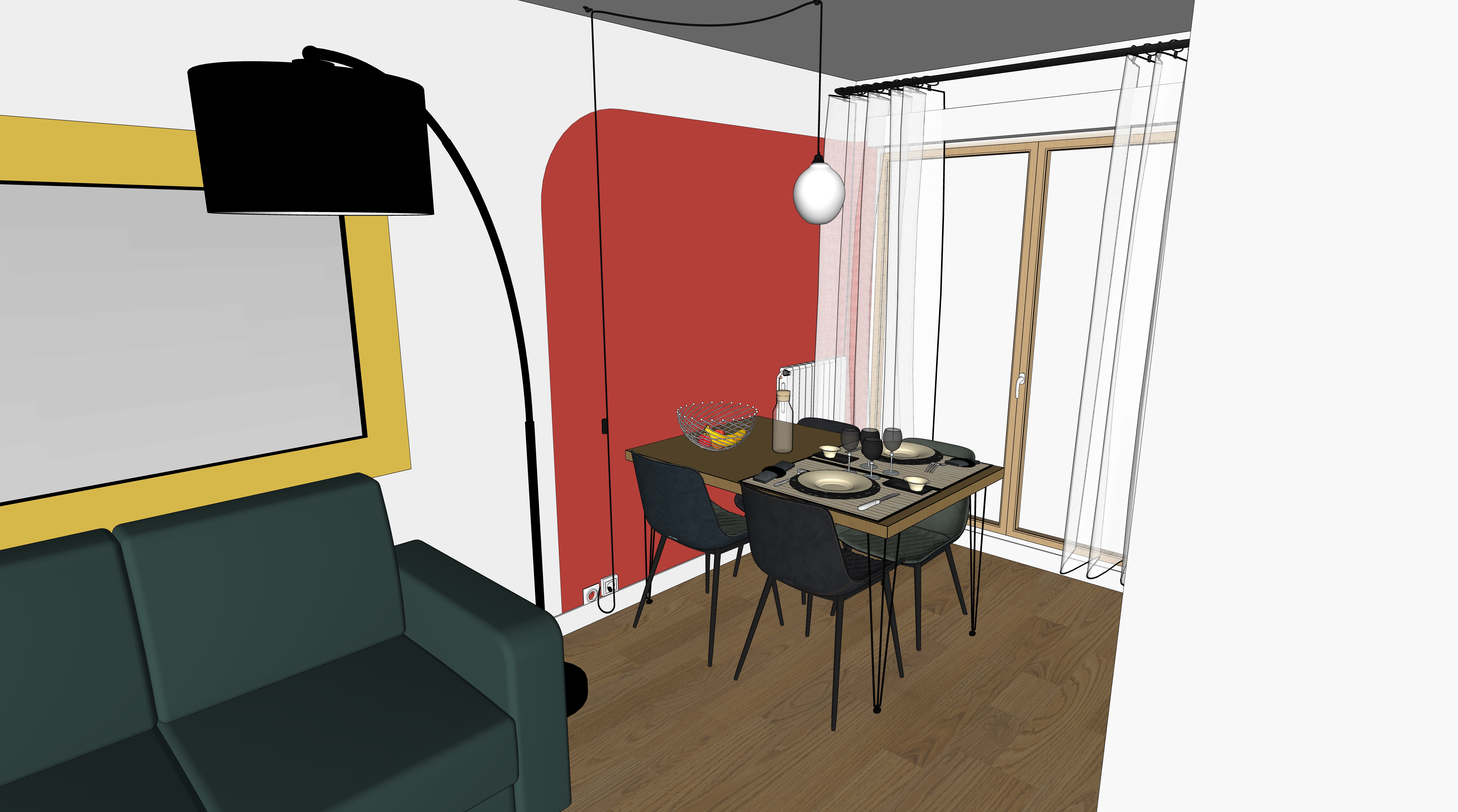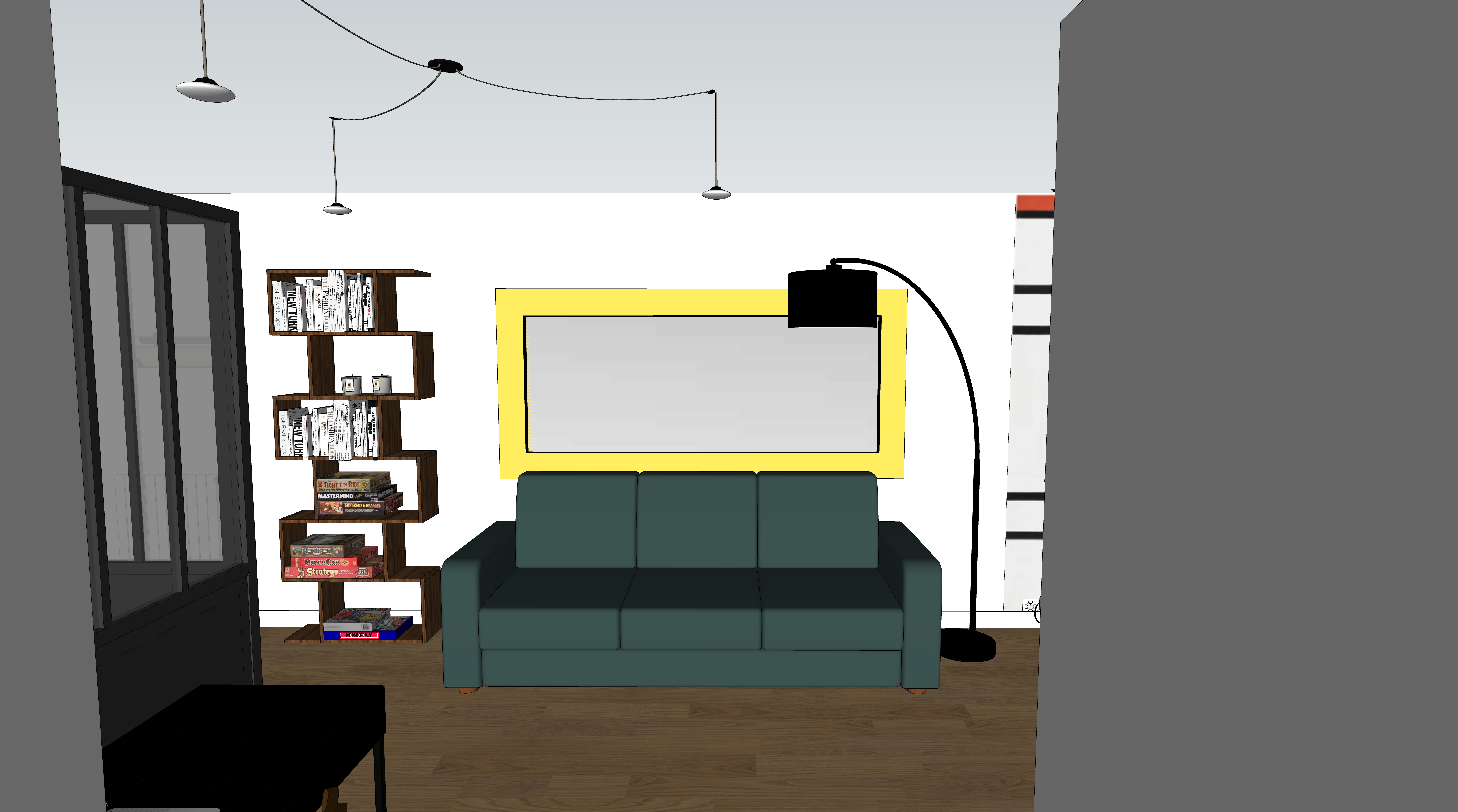 Dans son salon, c’est avec la couleur jaune que nous viendrons apporter du peps à la pièce, en créant un encadrement du miroir positionné au dessus de son canapé. Une suspension araignée sera installée, permettant ainsi d’installer les bras où le client le souhaite grâce à un système de crochets. En complément, un lampadaire arqué sera positionné à côté du canapé. Le client ne souhaitait pas de table basse, mais un coin bureau, pour lequel nous reprenons le code couleur du salon à mi hauteur sur le mur.
