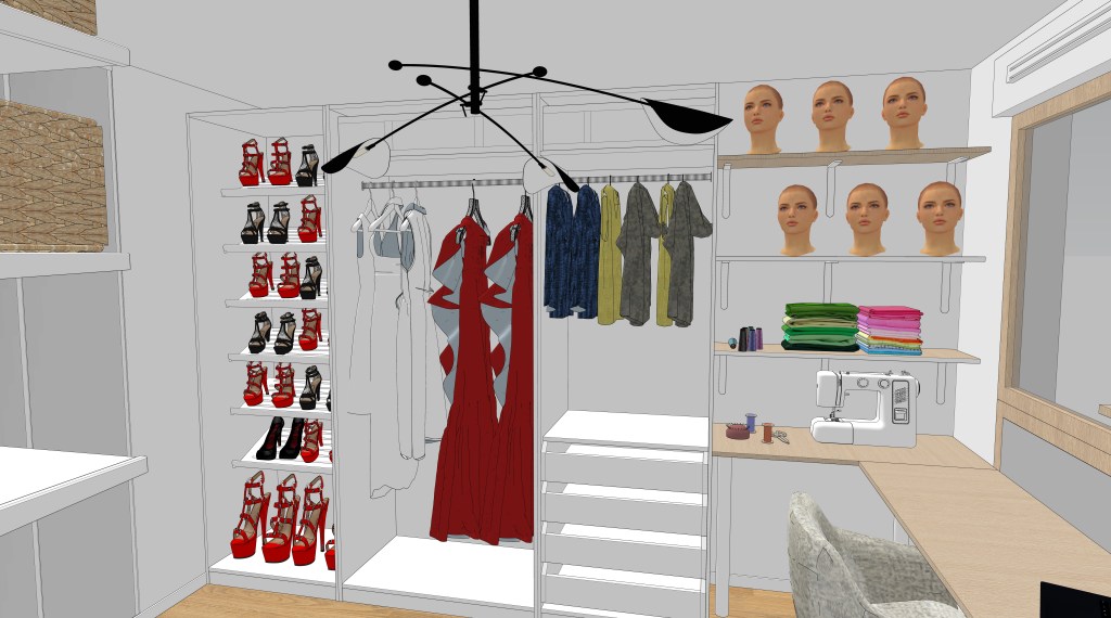 La 1ère vue présentée au client reprend le plan d’aménagement en 2D, modélisé cette fois-ci en 3D et mis en couleur. Cela me permet de présenter une vue aérienne et globale du projet, en précisant les choix de meubles. On y retrouve l’espace maquillage, de grands placards pour les costumes et le coin couture. Les étagères murales sont mises en avant, on traduit alors le plan 2D et on se projette un peu plus.